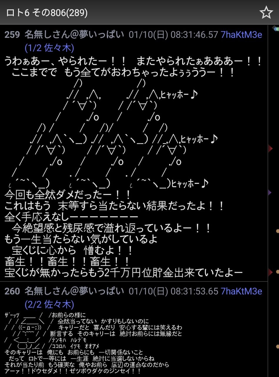 断末魔スレに紛れ込んで宝くじ買ってないのに演技で書き込んでる奴やろ