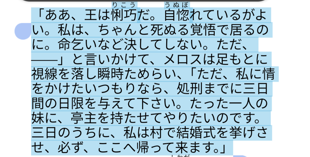 「ありがとう、友よ。」二人同時に言い、ひしと抱き合い、それから嬉し泣きにおいおい声を放って泣いた。